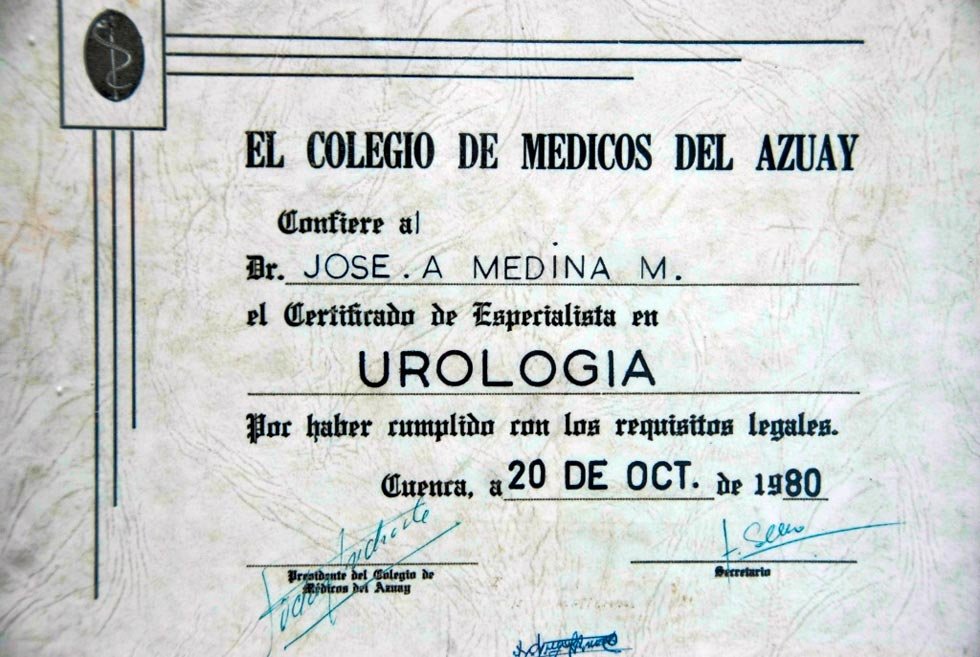 Certificado del Colegio de Médicos del Azuay, que reconoce como especialista en urología.