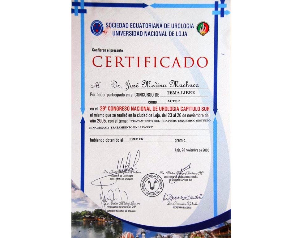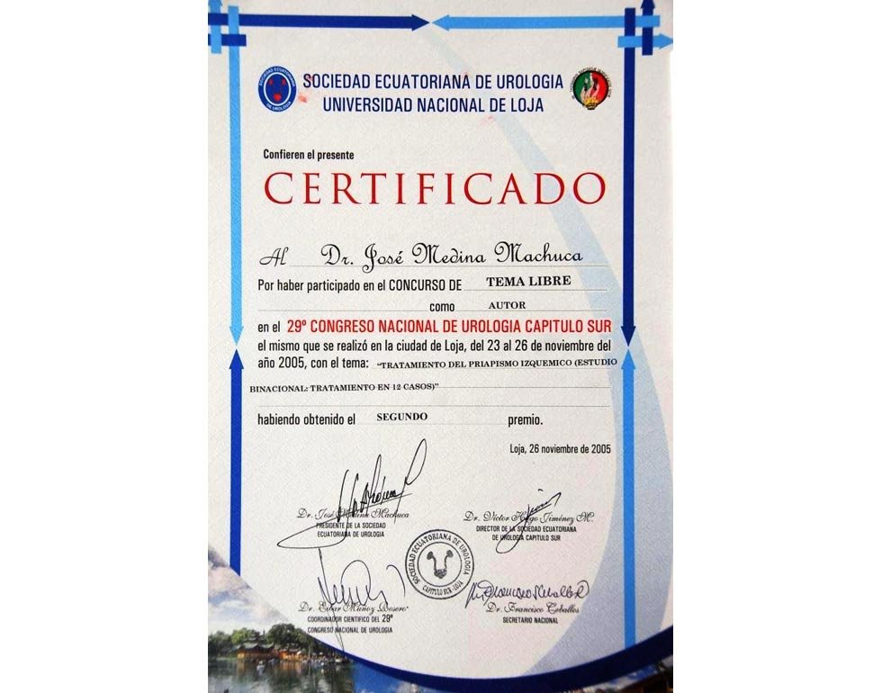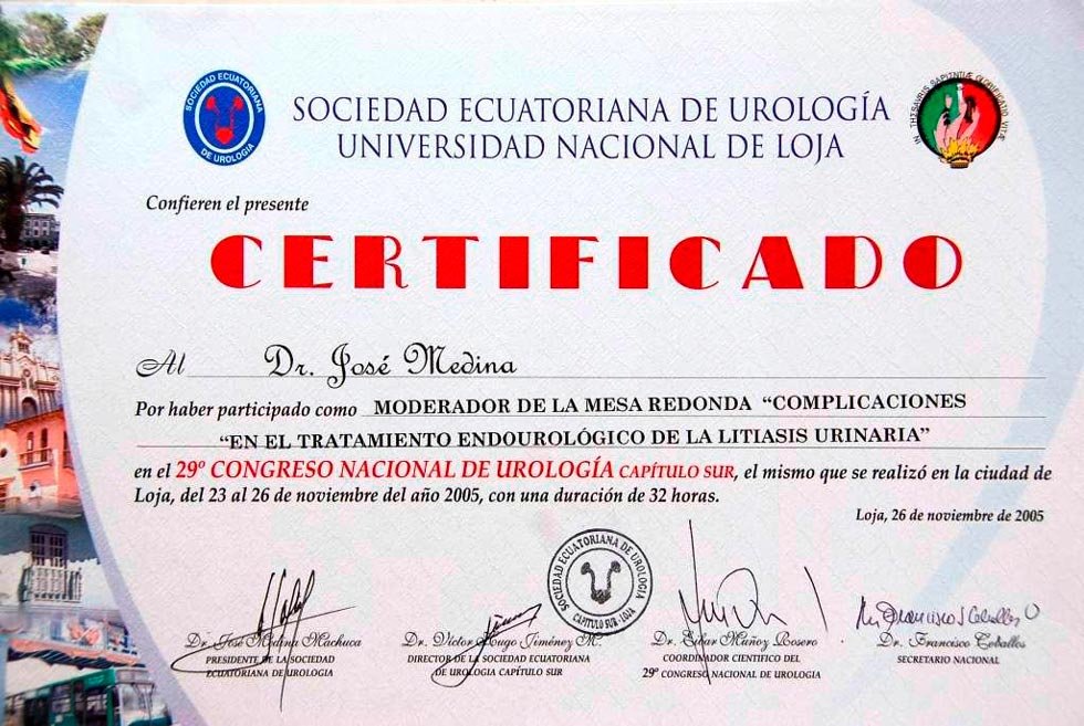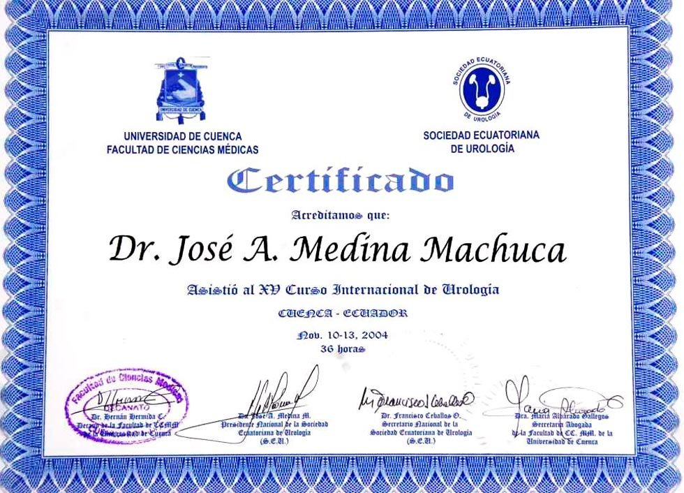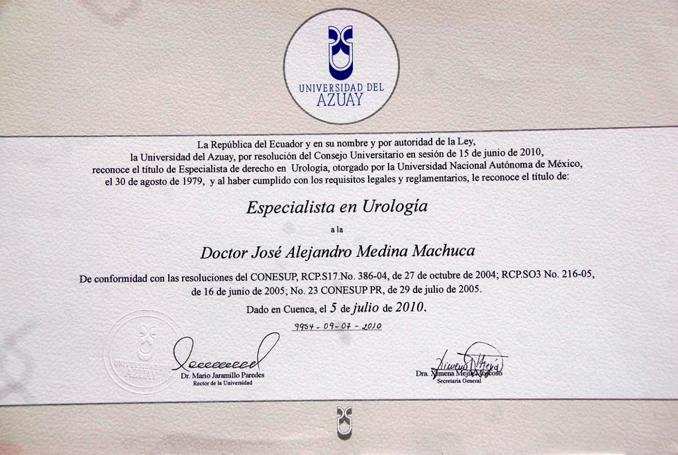 Certificado de la Universidad del Azuay  que reconoce  el Diploma  UNIVERSITARIO de Especialista  UROLOGO obtenido en  EL “Hospital General de México de la S.S.A. y en la   UNIVERSIDAD NACIONAL AUTONOMA DE MEXICO .