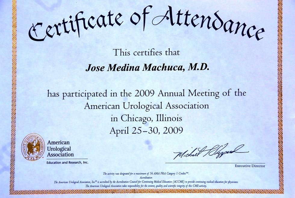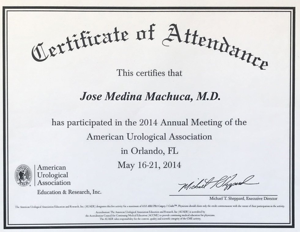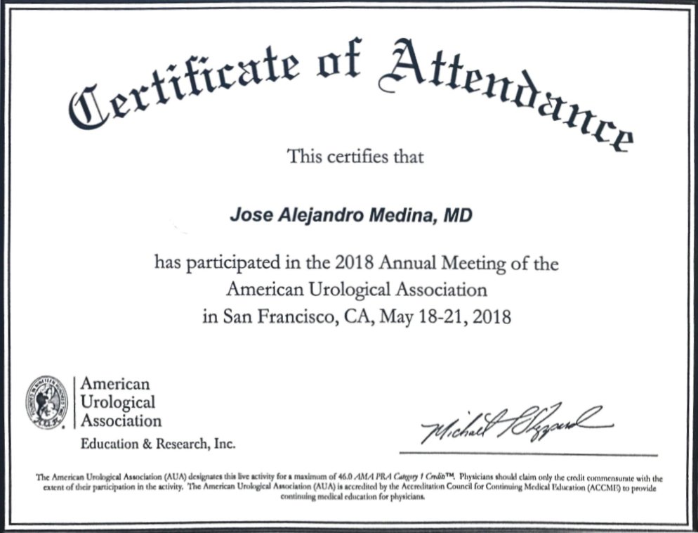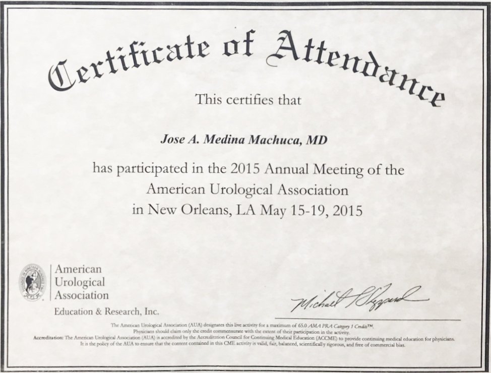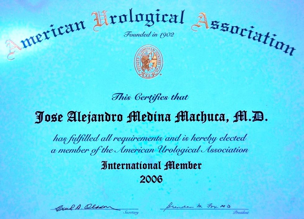 American Urological asociation que lo acredita como miembro correspondiente.   www.auanet.org