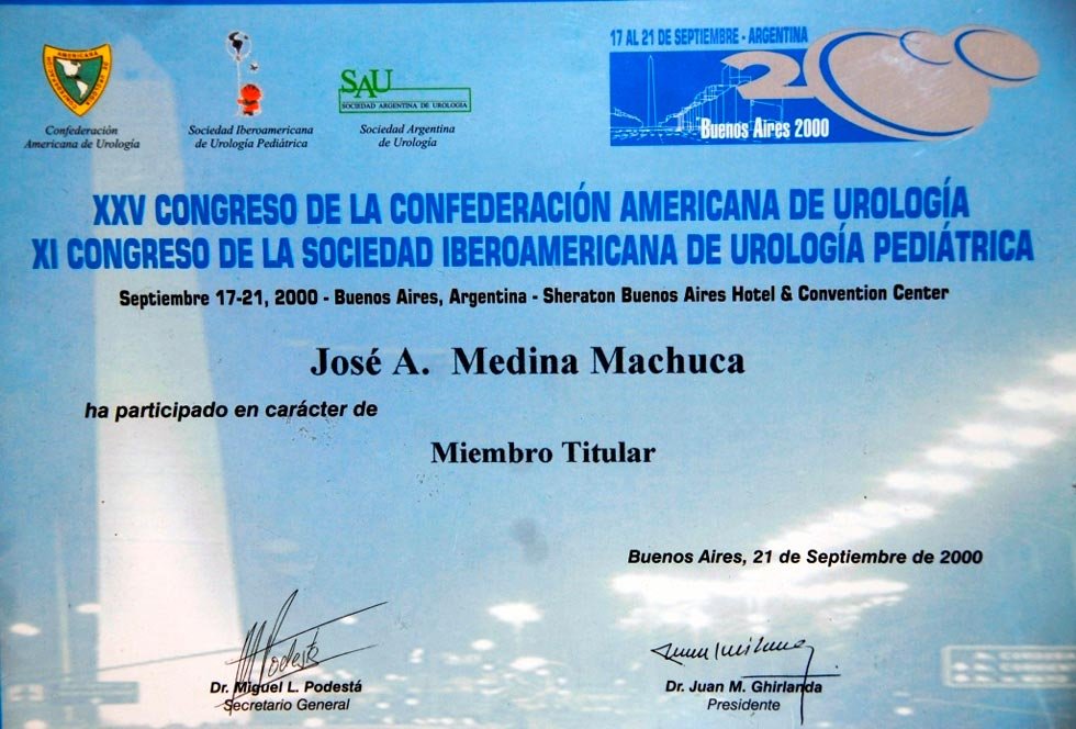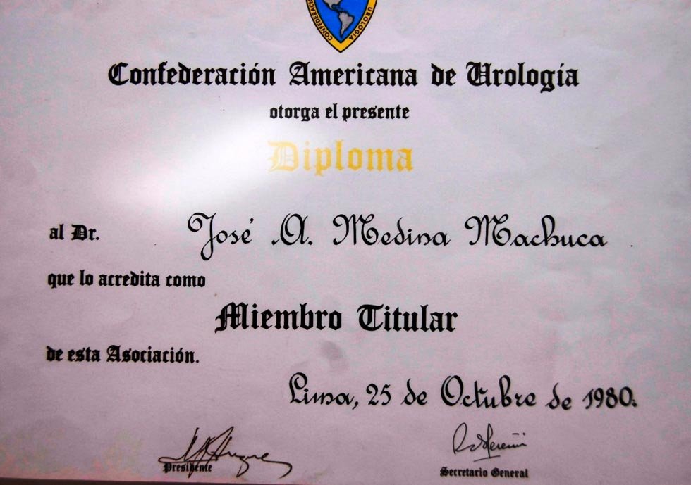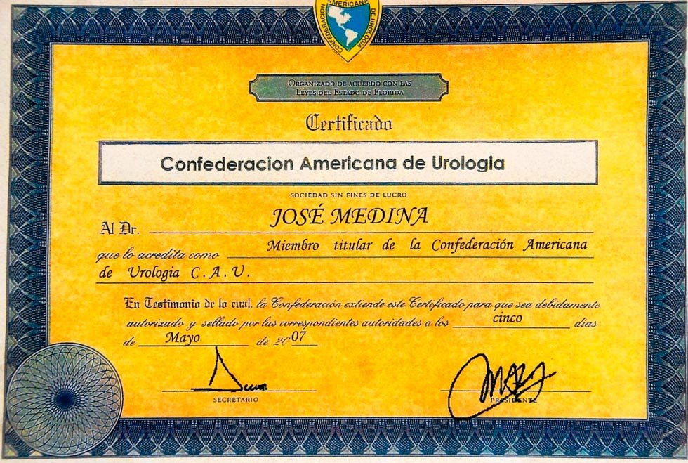 Certificado de la Confederación Americana de urología que lo acredita como miembro titular.  www.cauanet.org