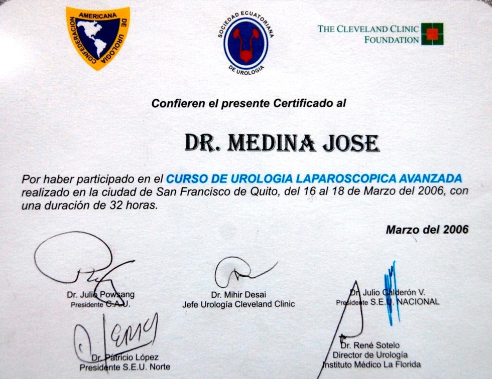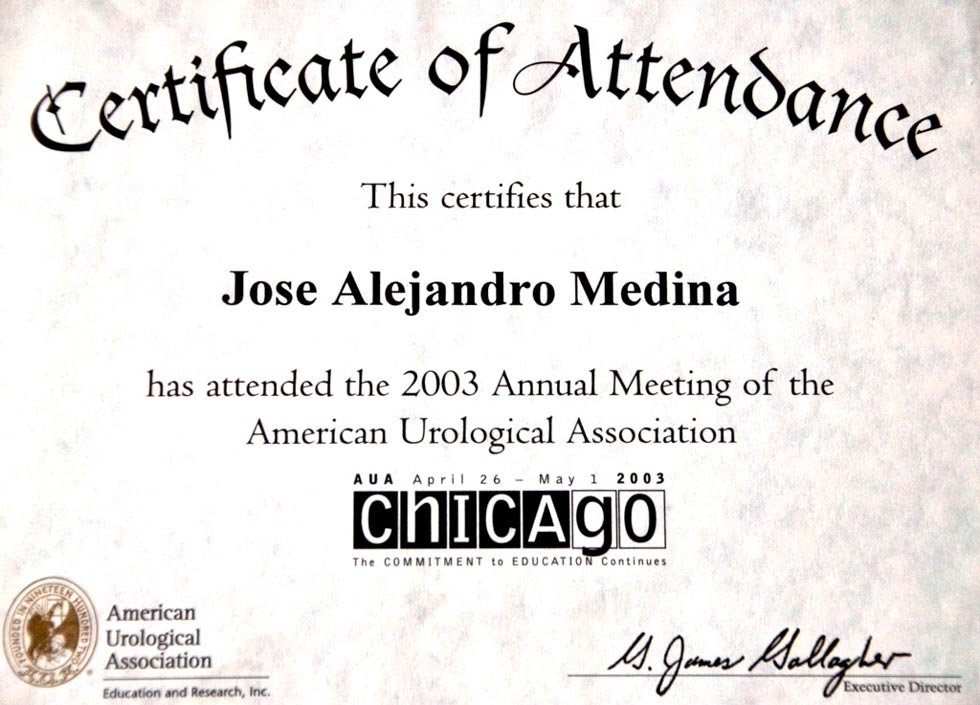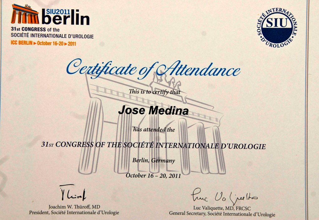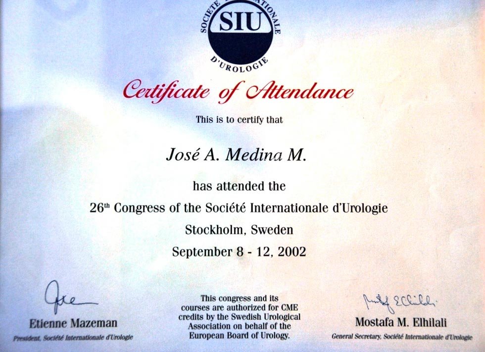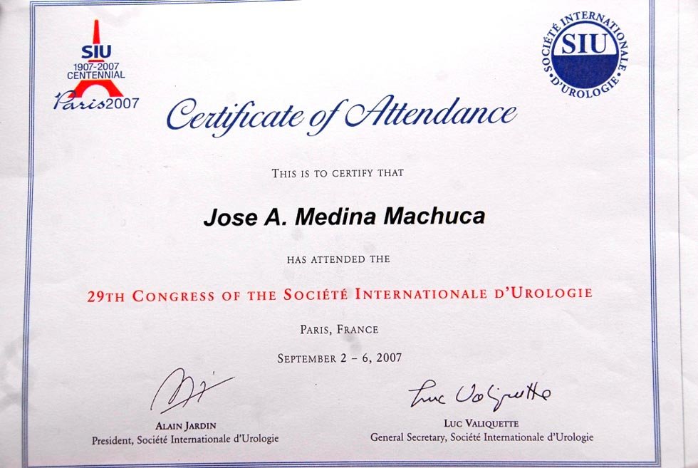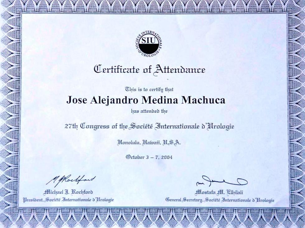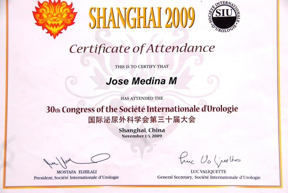 Certificado que el Dr. José A. Medina M., fue nombrado CHAIRMAN de la Sesión de Videos Moderados “VIDEO TOPICS IN UROLOGY”, octubre 5 en el 27th congreso de la Sociedad Internacional de Urología.  Honolulu – Hawaii