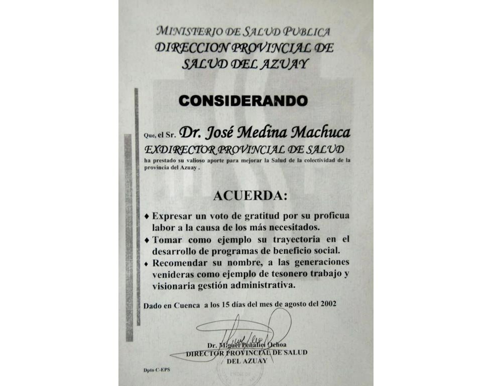 DIRECCIÓN PROVINCIAL DEL AZUAY, reconoce al Dr. José A. Medina M., como PRESIDENTEE DE LAS CLINICAS Y HOSPITALES PRIVADOS DEL AZUAY.  Año 1997.
