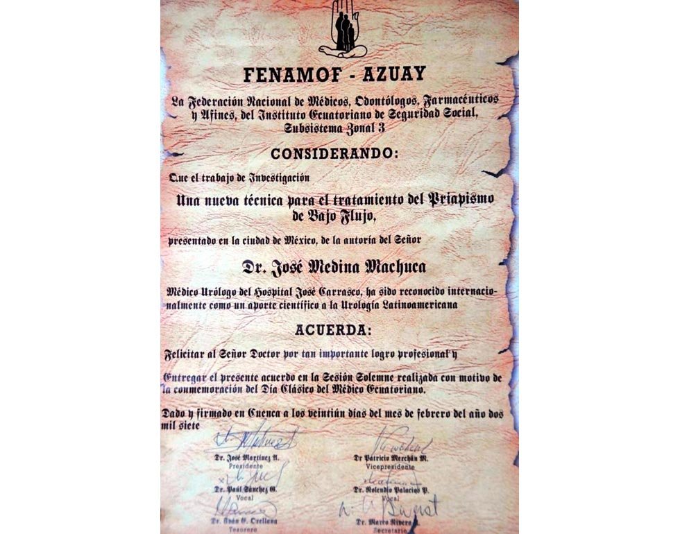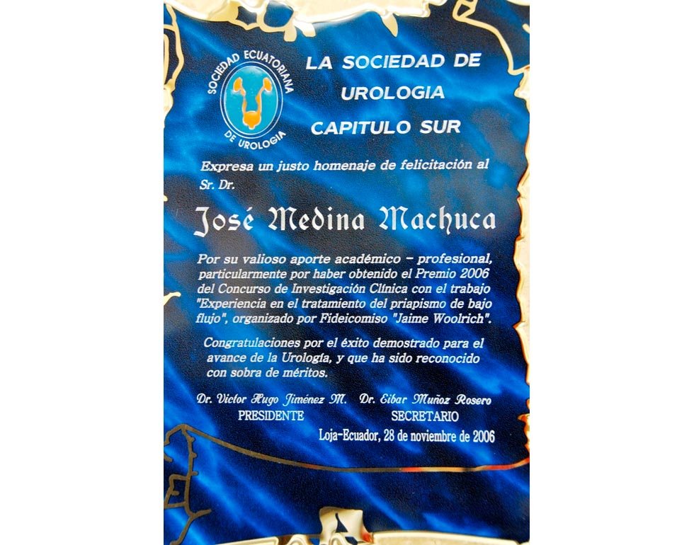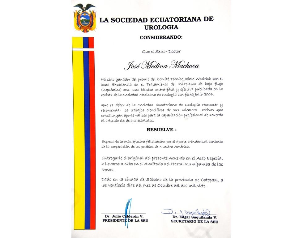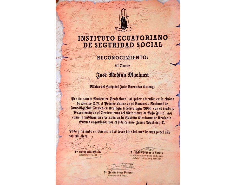 Hospital “Santa Inés”:  Carta de felicitación por haber presentado a nivel mundial en el vigésimo Congreso de la Sociedad Internacional de Urología, realizado en Stockolmo – Suecia, la nueva técnica quirúrgica para el tratamiento del priapismo.