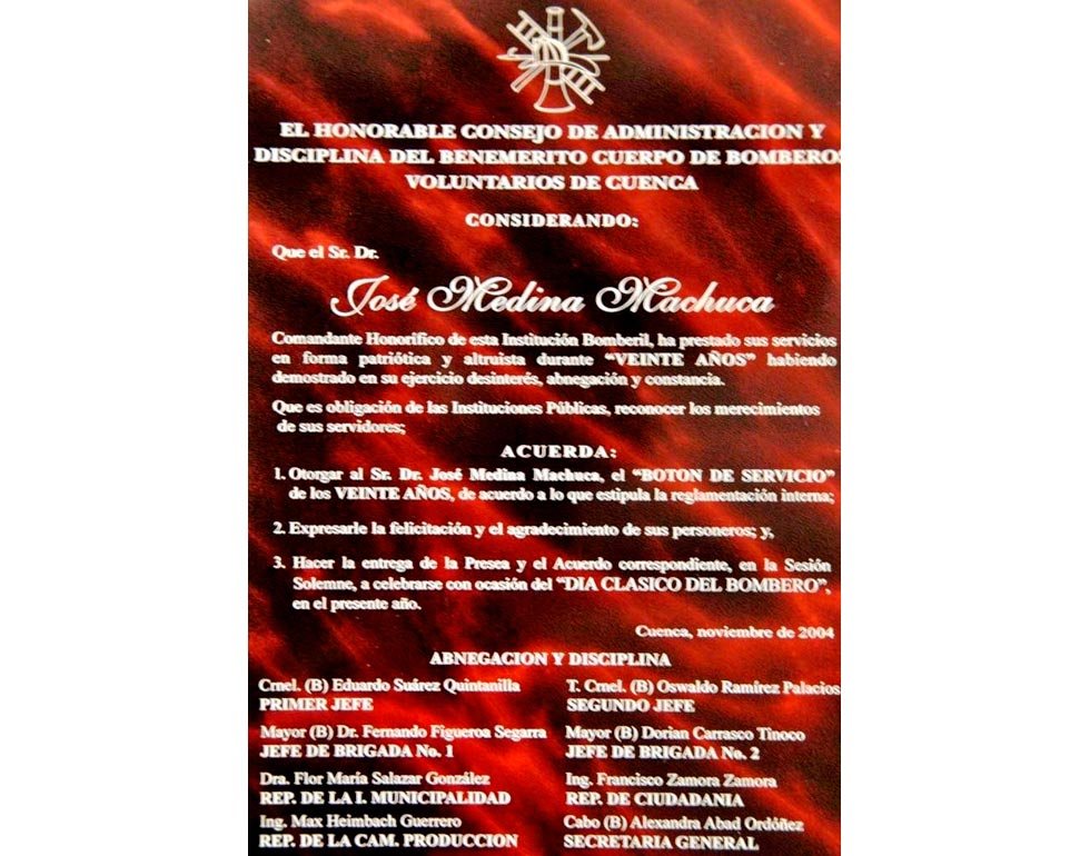 EL HONORABLE CONSEJO DE ADMINISTRACIÓN Y DISCIPLINA DEL BENEMERITO CUERPO DE BOMBEROS VOLUNTARIOS DE CUENCA.  CONFIERE UN ACUERDO POR 10 AÑOS DE SERVICIO PATRIÓTICO Y ALTRUISTA. COMO COMANDANTE MEDICO  HONORIFICO EN LA ESPECIALIDAD DE UROLOGIA