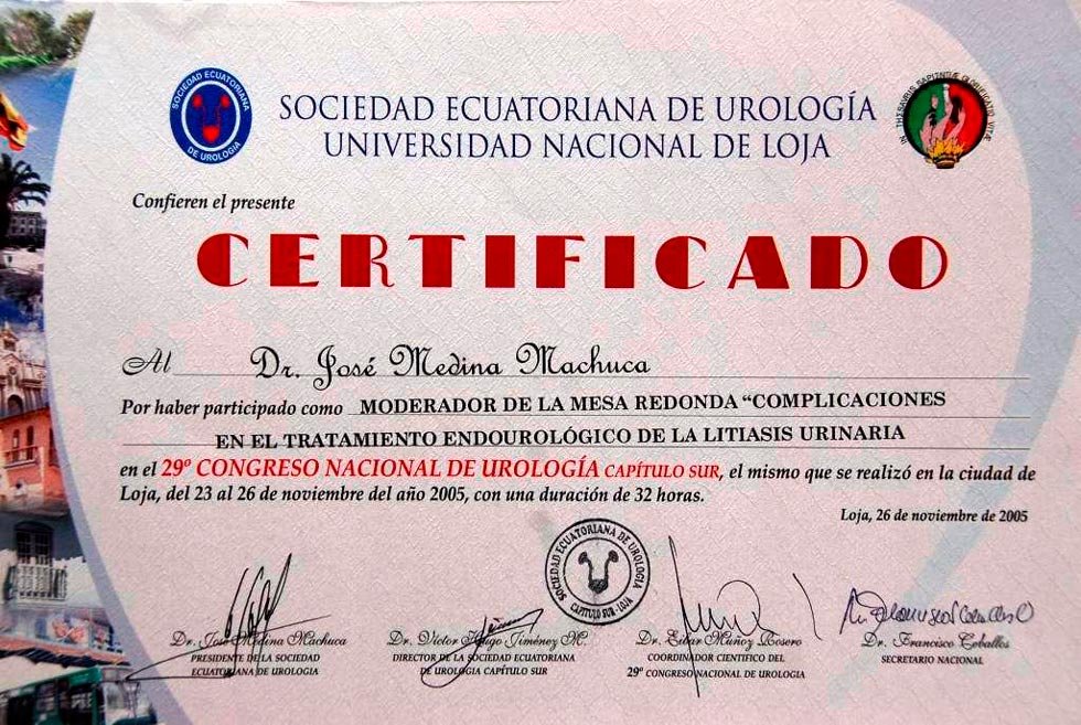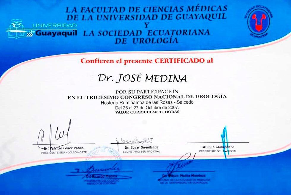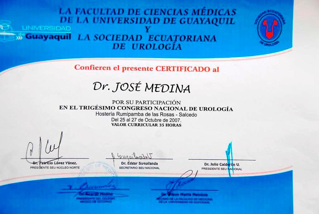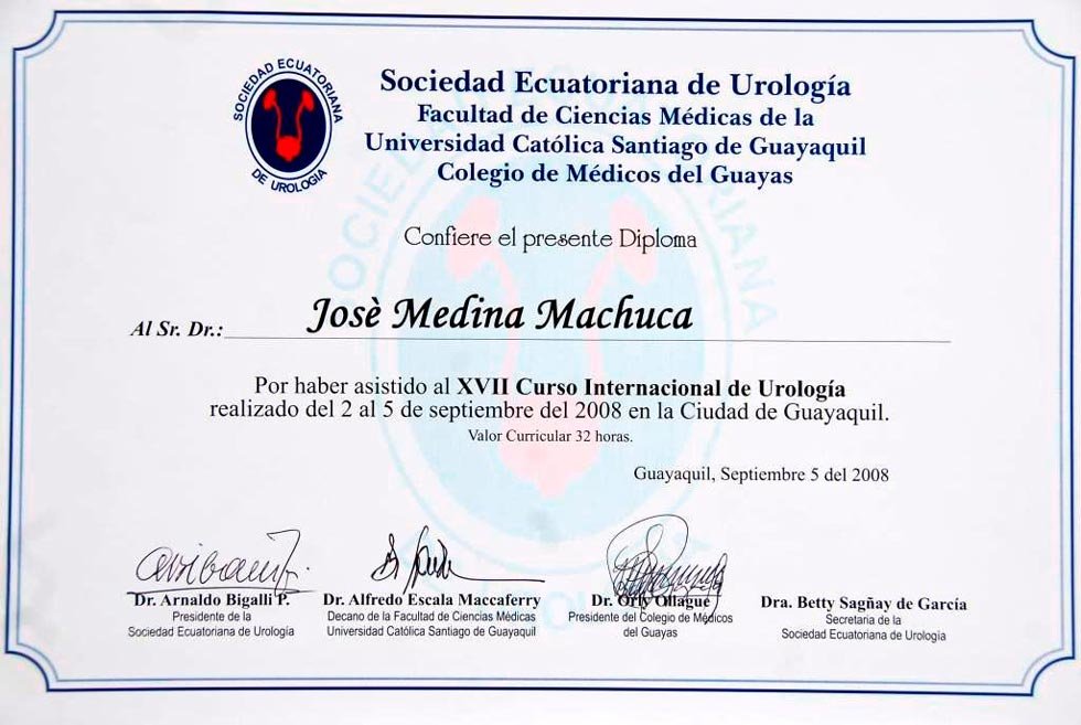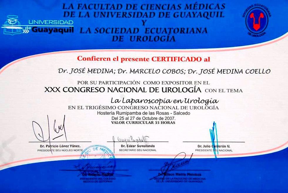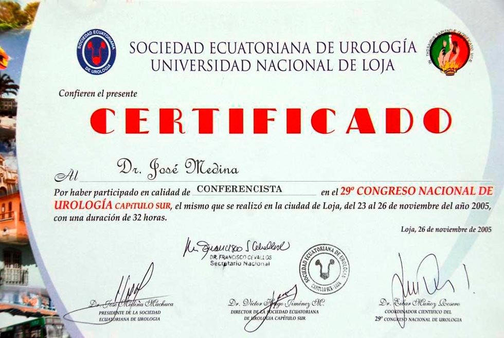 Facultad de Medicina de la Universidad Central, Colegio de MEDICOS DEL PICHINCHA. Calidad de PROFESOR CONFERENCISTA Y PANELISTA DEL XIII Curso Internacional de Urología.  XXV Congreso Nacional.