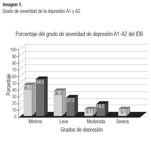 Los resultados arrojados en el inventario de depresión de Beck reportaron la presencia y grados de síntomas de depresión de la siguiente manera: En la primera aplicación (A1) presentaron depresión severa 9.1%, depresión moderada 9.1%, depresión leve 36.4% y depresión mínima 45.5%. En la segunda aplicación (A2) 18.2% presentó depresión moderada, 27.3% leve y 54.5% depresión mínima (Imagen 1).