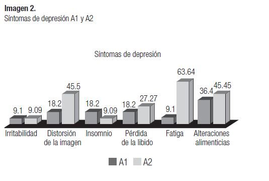 Los síntomas del inventario de Beck de Depresión (BDI), que se presentaron con mayor frecuencia, fueron: irritabilidad: 9.1% (A1), 9.09% (A2), distorsión de imagen: 18.2% (A1), 45.45% (A2), insomnio: 18.2% (A1), 9.09% (A2), pérdida de la libido: 18.2% (A1), 27.27% (A2), fatiga: 9.1% (A1), 63.6% (A2), alteraciones alimenticias: 36.4% (A1), 45.45% (A2) (Imagen 2).